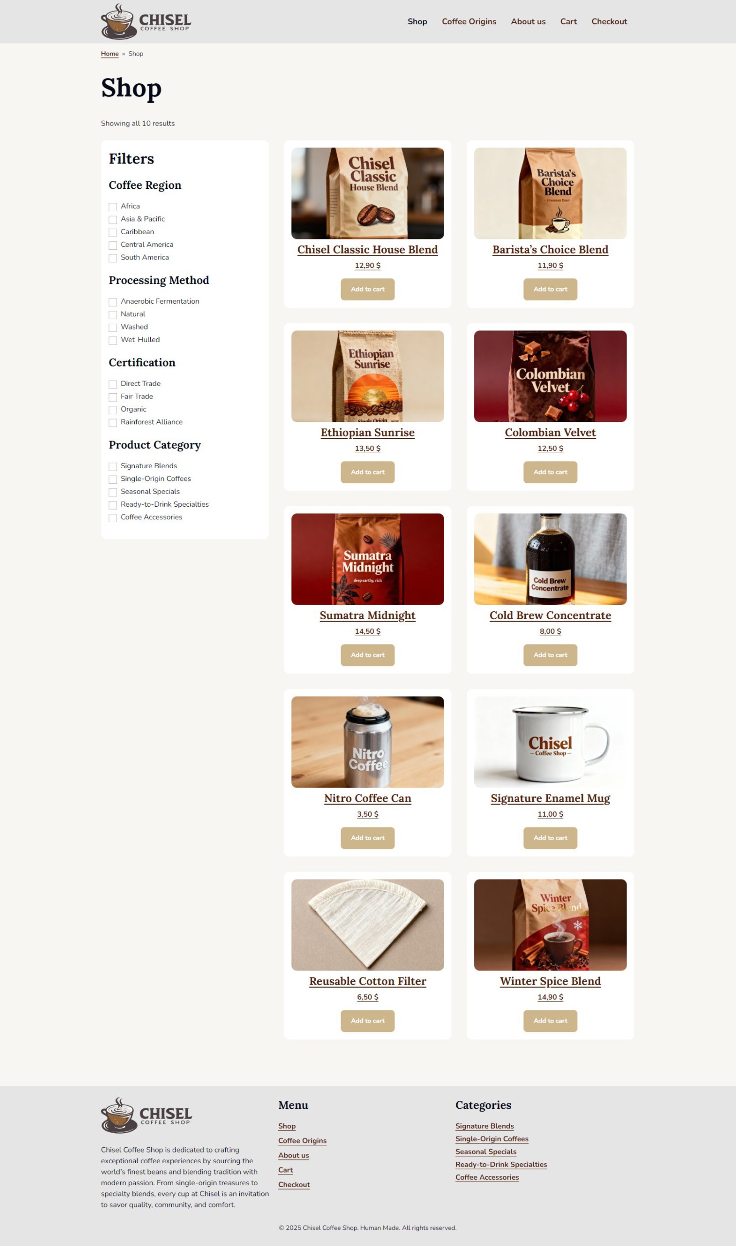 As your catalog grows, visitors expect quick, seamless filtering for products and origins. AJAX lets you fetch and display filtered results instantly, without a full page reload, creating a modern and smooth customer experience. In Chisel we use REST API for custom AJAX Request.